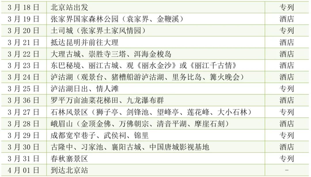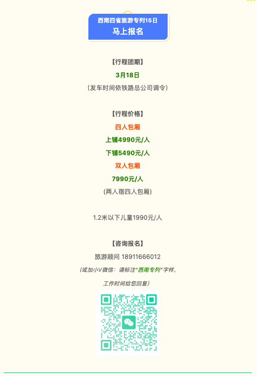 西南四省专列15日游上新啦!3月18日跟着我们出发吧!一次性玩遍20余个热门风景名胜、一次性领略各地独特的自然风光、一次性欣赏西南四省的靓丽春色!专列铺位数量固定,报满即封团,3月专列仅此一团,别错过哦!让我们坐着火车去旅行,春游踏青正当时~