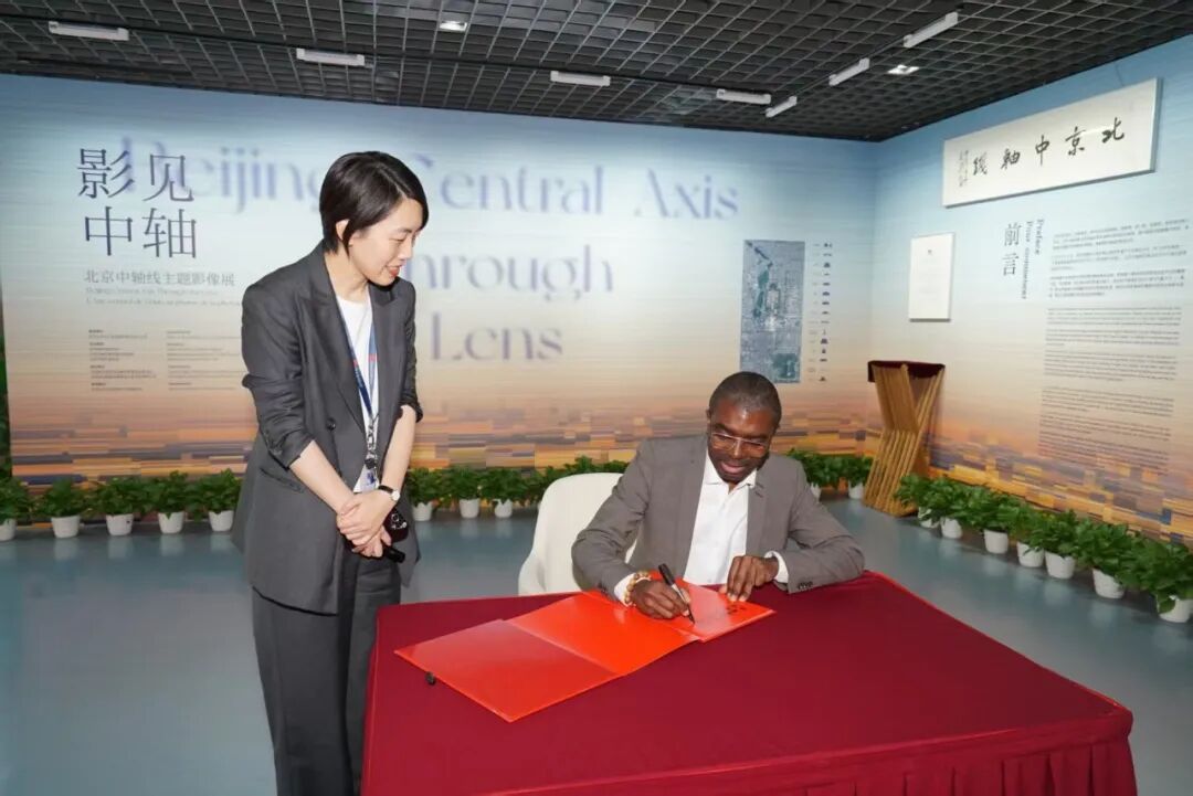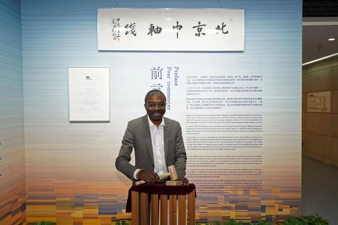 观展后,阿索莫先生欣喜地在《北京中轴线世界文化遗产证书》(复制品)和第46届世界遗产大会主席宣布北京中轴线项目列入《世界遗产名录》时的木槌前拍照留念,并在留言中写道:“这是一次难忘的北京市规划展览馆观展之旅。在这里我见到了北京中轴线世界遗产证书和在印度新德里召开的世界遗产大会宣布北京中轴线项目列入《世界遗产名录》时的木槌,我深感荣幸。”