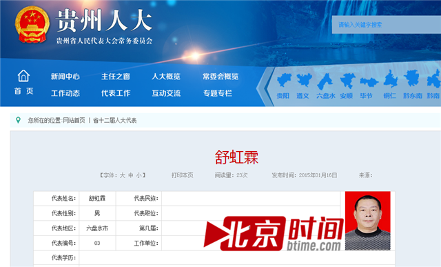 贵州省人大办公厅的官员向北京时间“暴风眼”(微信号:btime007)证实,舒虹霖现在仍是贵州省十二届人大代表。