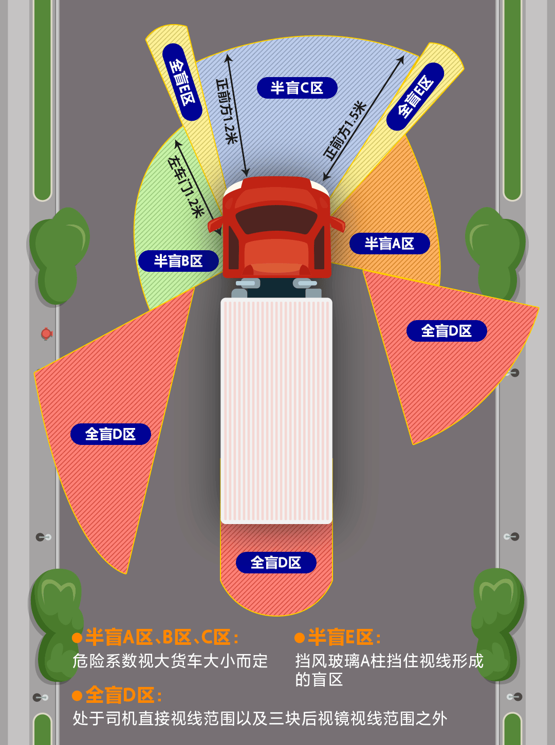大车右侧盲区约在货箱末端至驾乘舱末端位置,且距离货车宽度约为1.5米的范围,货箱越大盲区越大。