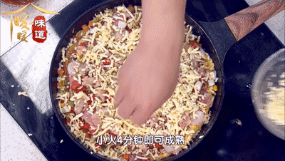 将炒好的配料倒入玉米烙中,然后在表面均匀撒上一层芝士碎,加上锅盖小火焖煮3分钟左右,待芝士融化即可出锅,改刀切块完成~