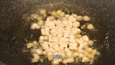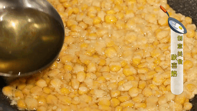 煎制:热锅凉油,先用底油润锅,改小火下入玉米粒煎制,用勺子将玉米粒压瓷实,然后小火慢煎至定型即可。