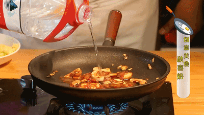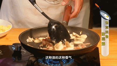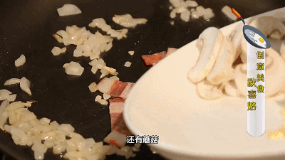 另取一只锅,油烧热下入洋葱粒,煸炒至透明色,加入切好的口蘑、培根,煸炒出焦香味。