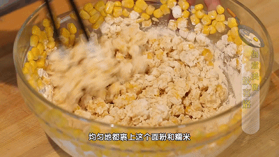 取一只大碗,在大量的玉米粒中加入全蛋液拌匀, 然后加入比例为1:1的面粉、糯米粉,顺着一个方向拌至裹匀即可。