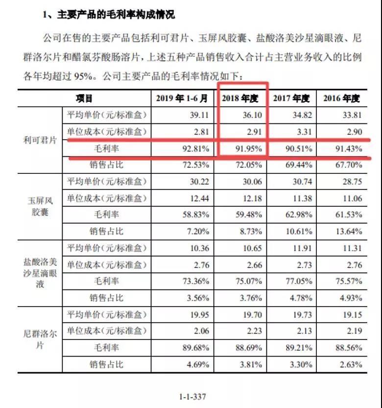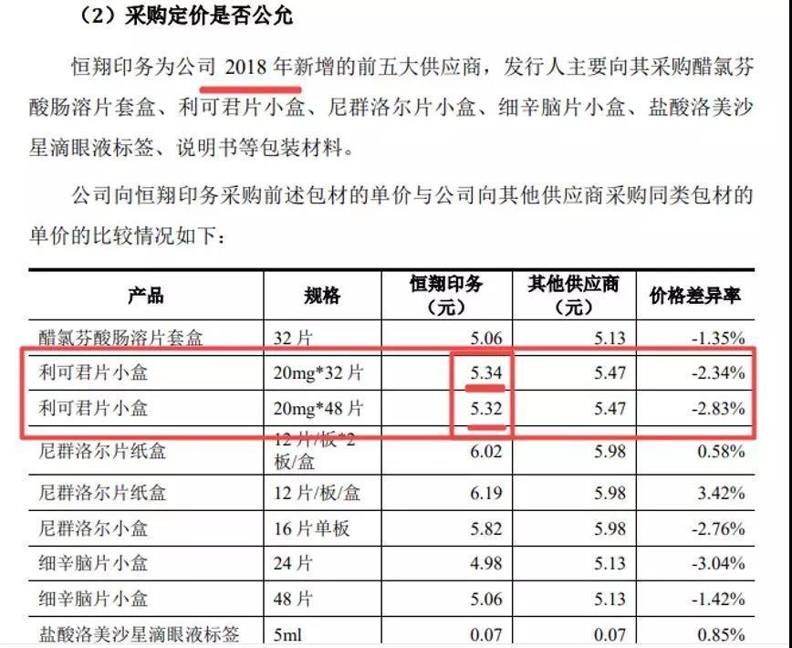 招股说明书337页显示其单位成本和单价。利可君片每标准盒单位成本在报告期内是2.81元到3.31元之间,2018年是2.91元,而吉贝尔审核问询回复函258、259页显示,新增的前五大供应商恒翔印务,吉贝尔采购单价是5.34元和5.32元,超出了其单位成本价,难道利可君片的成本价不包括包装盒?