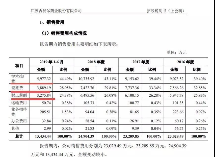 招股书显示,吉贝尔报告期内销售费用分别是2.3亿元、2.3亿元、2.5亿元,而同期研发费用则分别是1675万元、1714万元、1960万元和1084万元,销售费用是研发费用13倍之多。