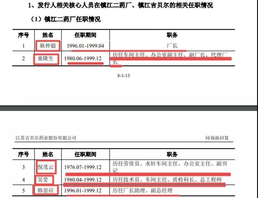 然而,在上交所审核问询回复函中,吉贝尔披露了耿仲毅及吉贝尔核心人员在镇江市第二制药厂(简称“镇江二药厂”)和镇江吉贝尔的工作时间和任职情况。