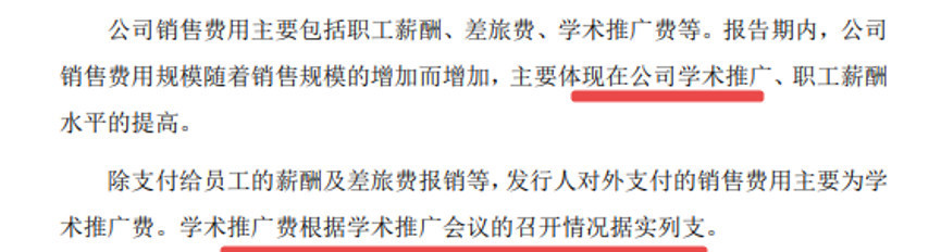 而在销售费用中,学术推广费用最高。吉贝尔报告期内,学术推广费分别是9074万元、9154万元、1.07亿元和5977万元,远高于同期差旅费和职工薪酬。招股书显示,学术推广费根据学术推广会议的召开情况据实列支。然而,招股书仅仅列出学术推广费前五大支付对象,至于学术活动的细节则未披露。