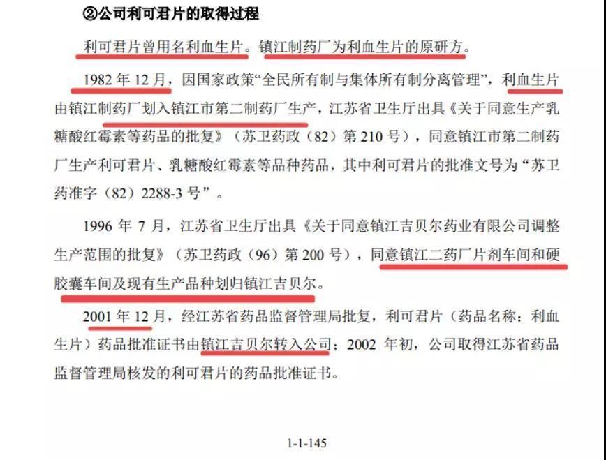 然而,招股书第145页显示,吉贝尔的主打产品利可君片原用名利血升片,原研方是镇江制药厂,后来划入镇江二药厂,后划入镇江吉贝尔,最后花落吉贝尔。