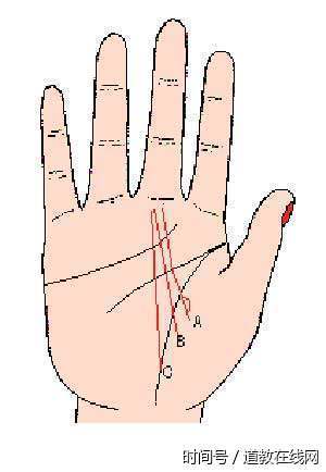 白手起家者的手相特征命运线起自金星丘,表示靠异性或亲属的提拔来开运(记号B),但此线短得达不到头脑线,即使受了其恩惠,也只有一时的。如此线下端有岛纹,(记号A)表示与较自己有钱,或有才能或有地位的人同居,虽然可享受快乐的物质生活,但两人之间的关系不正常。命运线起于生命线下部,(记号C)主少年时代父母穷困或无依靠,必须靠自己的努力奋斗,去开拓命运,靠自己的努力而白手兴家。