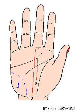 起自月丘(图蓝色位置部分,通常掌管健康)斜立的命运线,(记号A)表示受大众欢迎、宠爱等幸运之手相;如命运线延伸与感情线相切,表示可成为影星、歌星和出风头的运动员、舞蹈家或外交家,命运线良好加上太阳线又不错,则在这些行业中,能博得名气;此线又主与事业外国人有关。命运线的一部分在生命线上,另一条命运线从手腕的中央伸起,(记号B)主这些人受父母恩泽而外,能发自己的力量奋斗努力;大多数大学毕业后,自食其力以建立家庭。