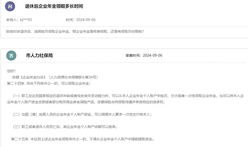 近日,有市民咨询:60岁退休后,选择按月领取企业年金,那企业年金是终身领取,还是有领取月份限制?