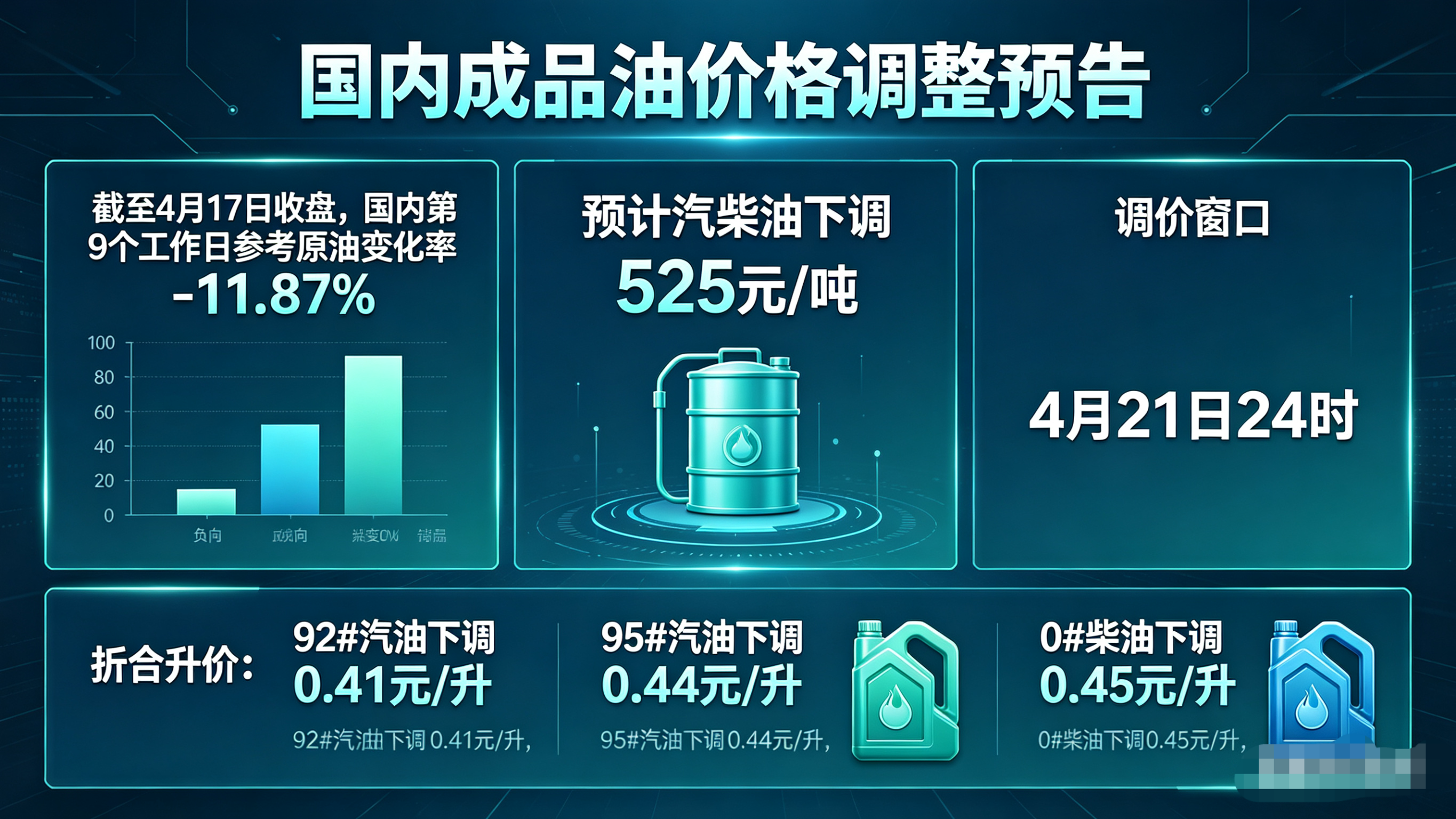 据测算,截至4月17日收盘,国内第9个工作日参考原油变化率-11.87%,预计汽柴油下调525元/吨,调价窗口4月21日24时。折合升价92#汽油、95#汽油、0#柴油分别下调0.41、0.44、0.45元。本次下调落实后,消费者用油成本将有减少。以油箱容量为50升的小型私家车为例,加满一箱92#汽油将少花20.5元左右。以月跑两千公里,百公里油耗在8升的小型私家车为例,到下次调价窗口也就是2026年5月8号24点之前,消费者用油成本将下降37元。物流行业,以月跑10000公里,百公里油耗在38L的重型卡车为例,在下次调价窗口开启前,单辆车的燃油成本将减少969元左右。具体调价幅度请以国家发改委最终公示为准。