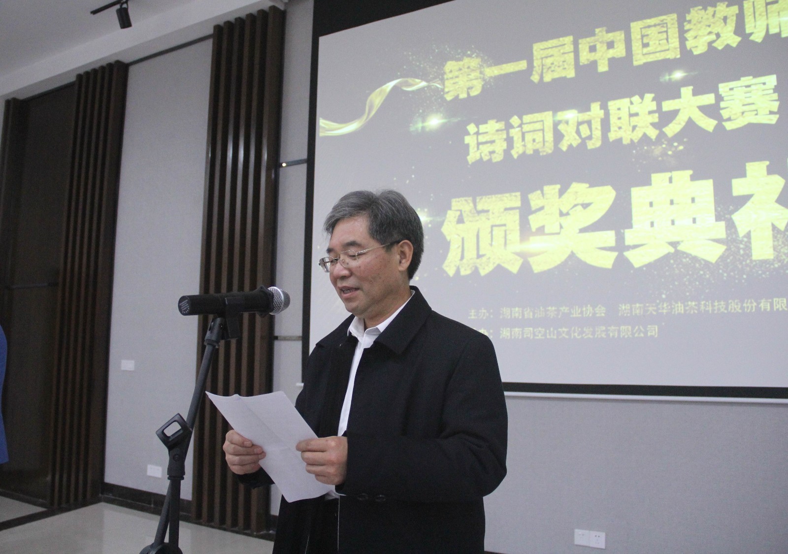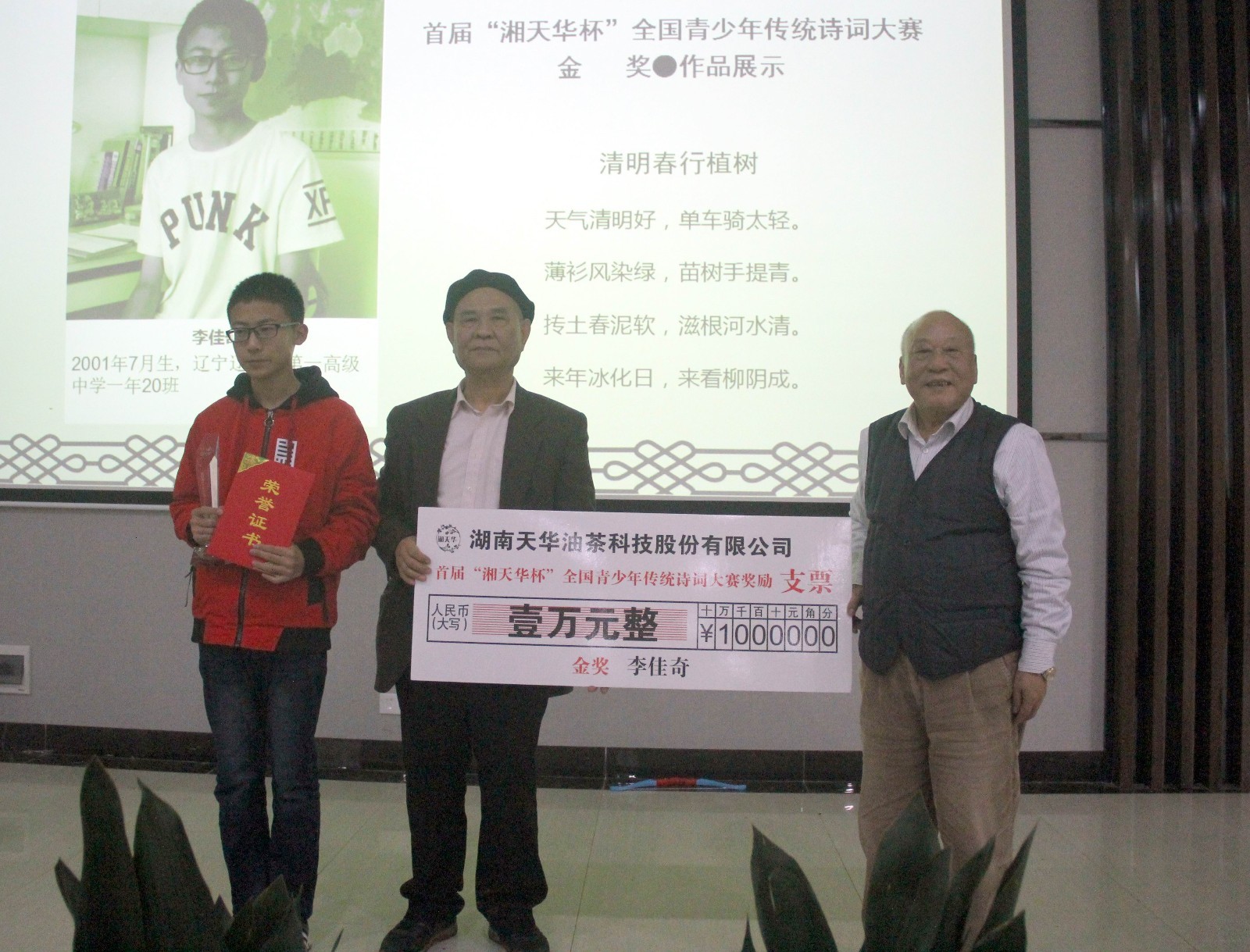 攸县县委副书记唐卫湘为教师赛铜奖颁奖,中国地质大学教授、中国楹联学会创建人常江老先生为教师赛银奖颁奖,湖南省林业厅副巡视员张凯锋、中国扶贫开发协会顾问杜远明为教师赛金奖颁奖,空军大校、青少赛评委会主任魏新河先生为青少赛网络人气奖第一名颁奖,攸县副县长唐军全为青少赛组织奖颁奖,中山大学教授、青少赛顾问张海鸥、黄坤尧两先生为青少赛优秀奖颁奖,香港铜锣湾集团董事局主席、大中华诗词协会创会会长陈智先生为青少赛铜奖颁奖,湖南省林业厅油茶办主任蓝成云为青少赛银奖颁奖,中国人民大学博士生导师马庆泉与汪良忠博士为青少赛金奖颁奖。