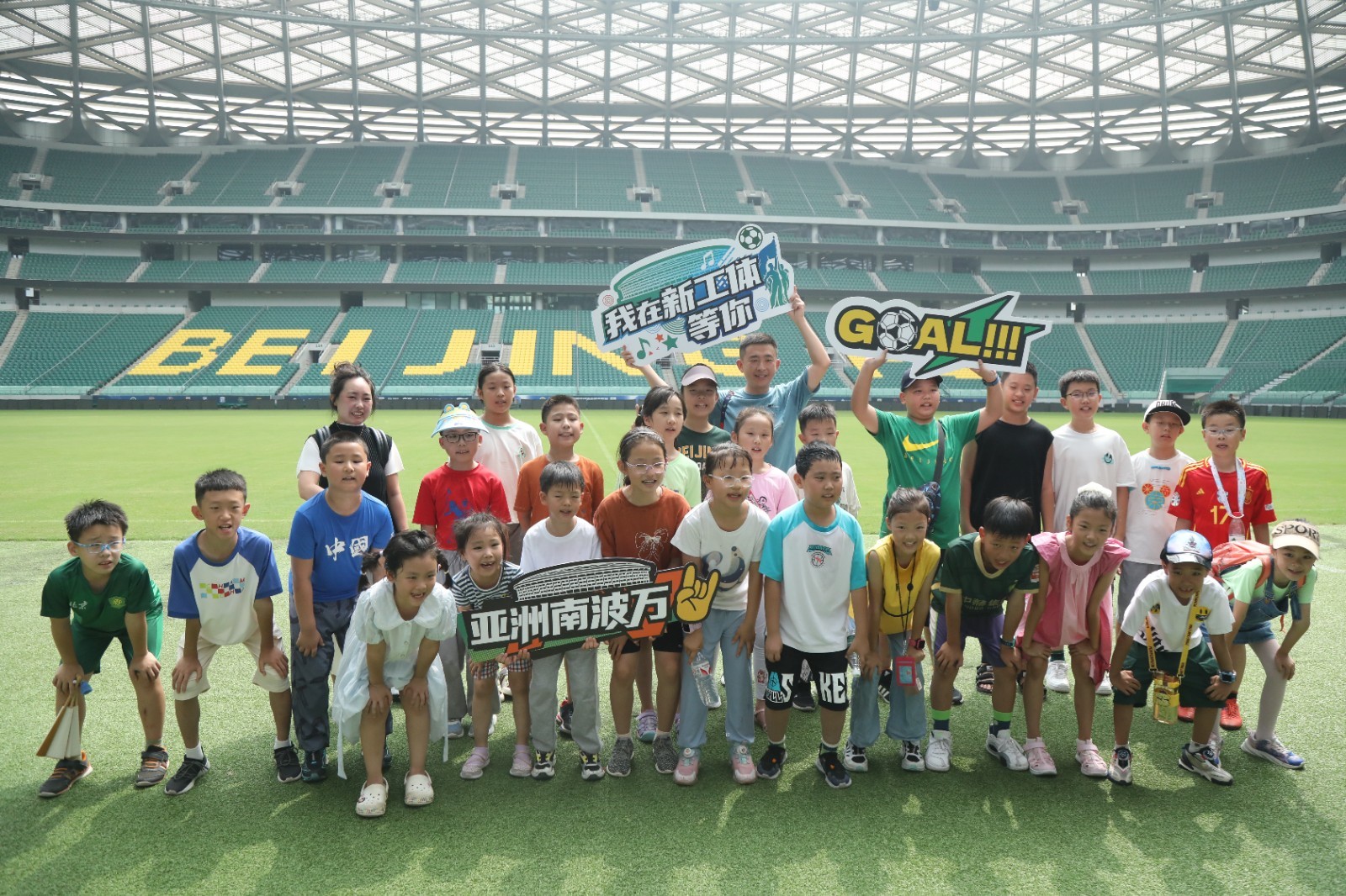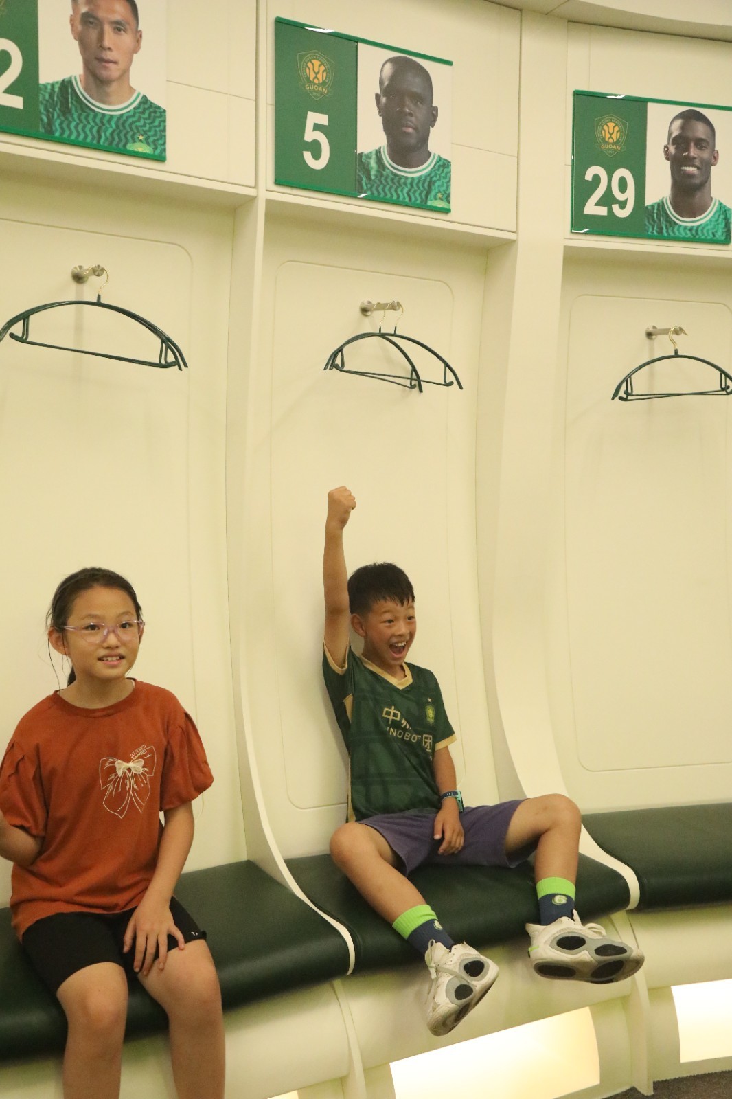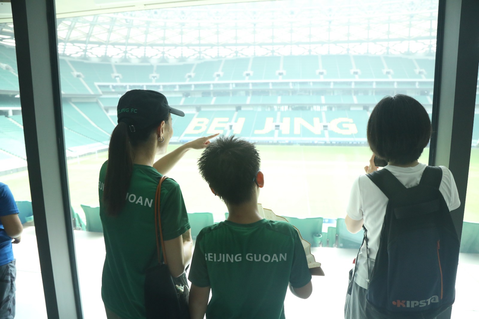 在比赛看台,6.8万张“国槐绿”座椅尽收眼底,孩子们面对着标志北京足球俱乐部的“BEIJING FC”字样,感受着这座宏大的体育场馆所带来的冲击与震撼。