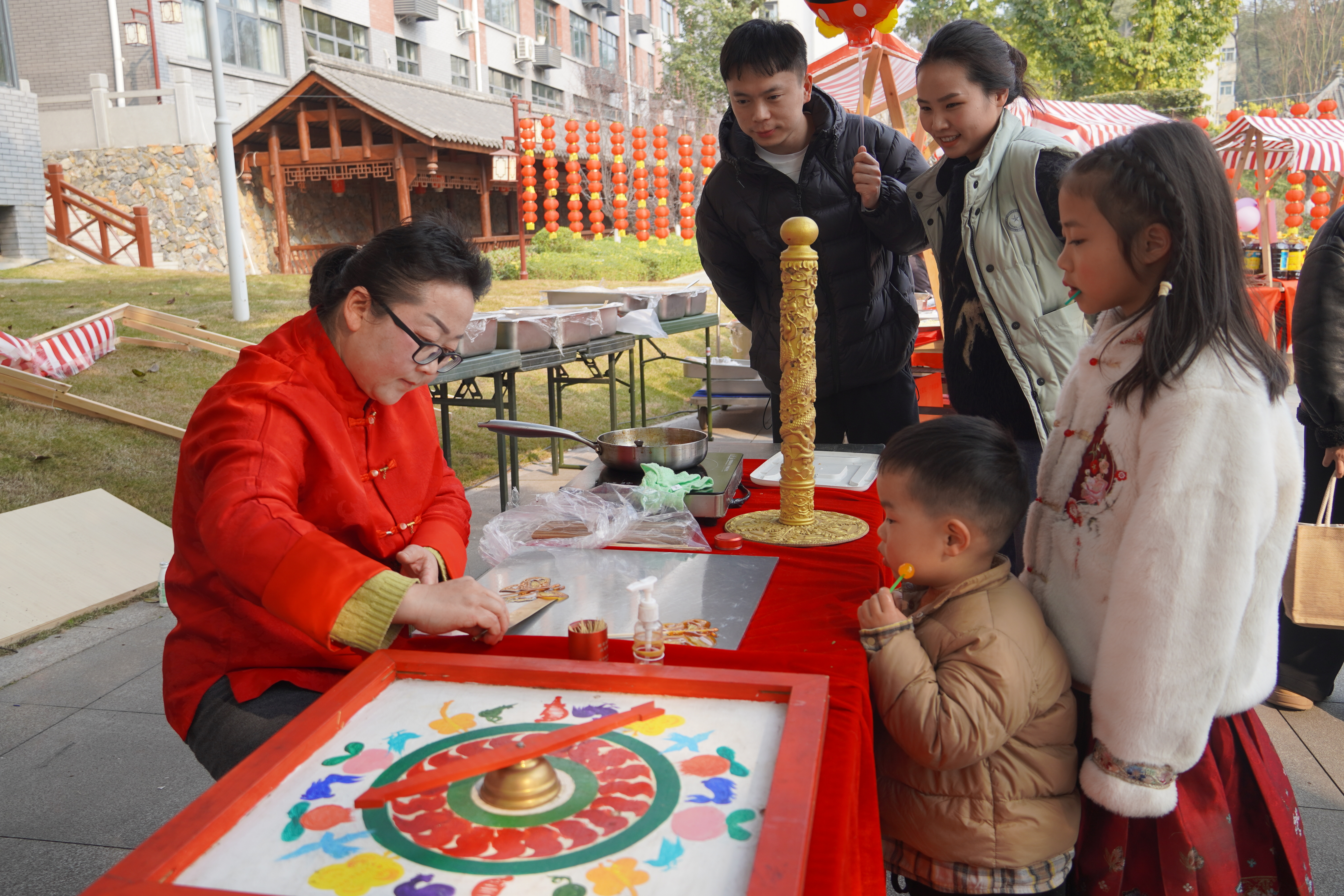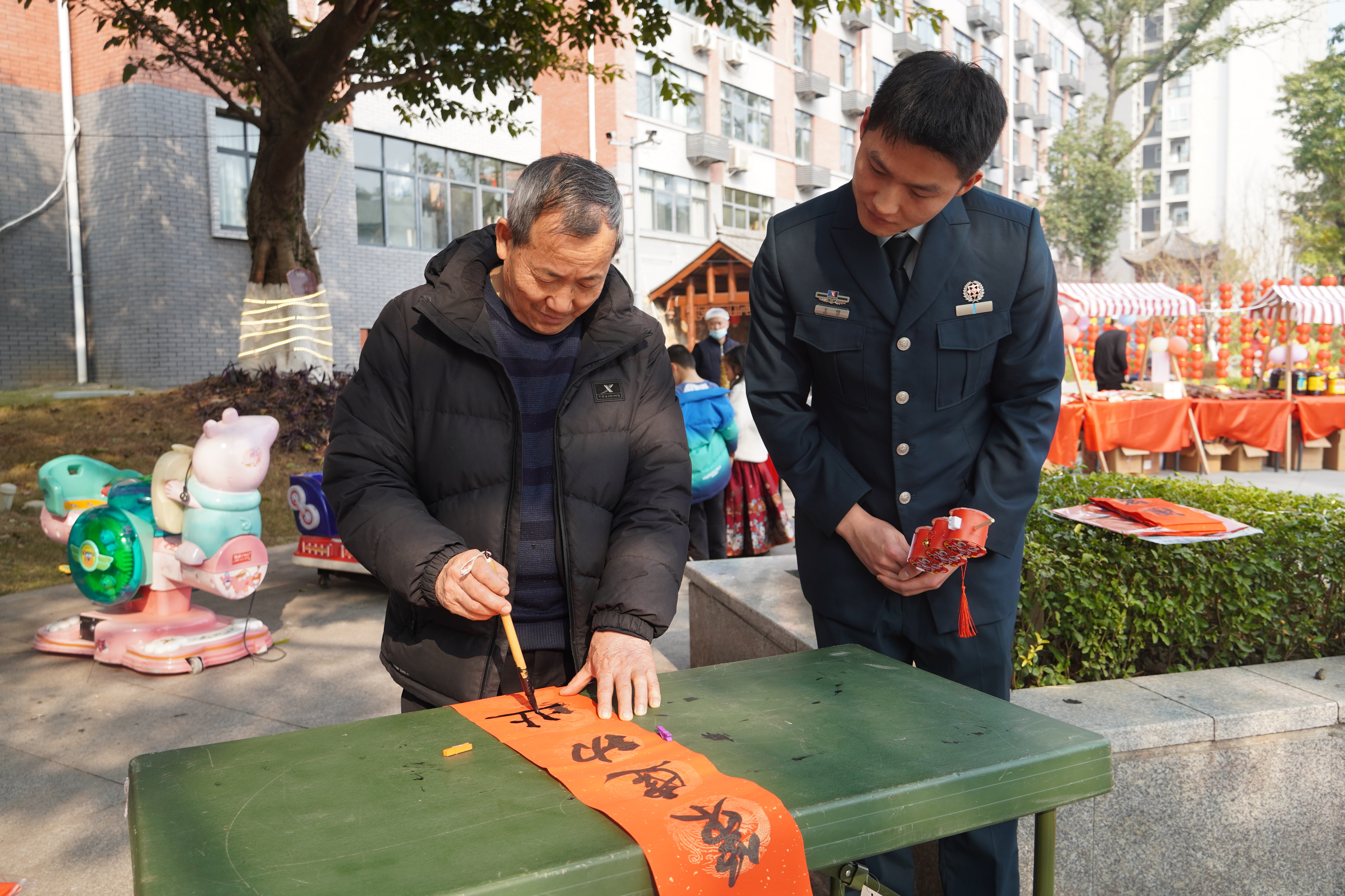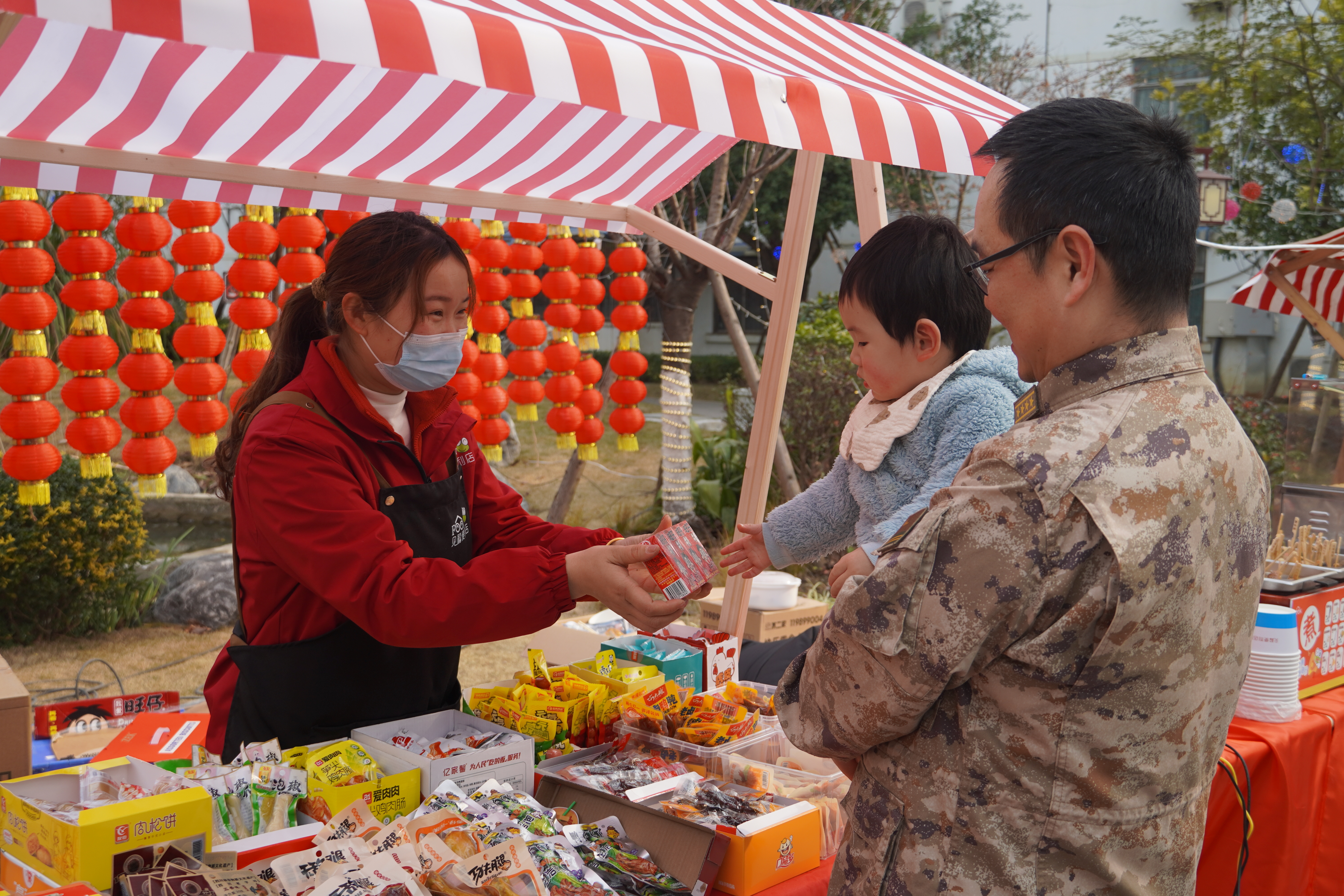 除了舌尖上的满足,文化体验区同样热闹非凡,成为年货节的一大亮点。现场设置了写春联、扎灯笼等传统民俗体验环节,大家挽起袖子、踊跃参与,笔墨挥毫间,一幅幅寓意吉祥的春联新鲜出炉;巧手翻飞中,一个个色彩艳丽的灯笼点亮年味。另一边,精彩的川剧变脸表演引得阵阵喝彩,传统民俗小游戏区更是排起长队,官兵与家属们携手互动,欢呼声、笑声此起彼伏,将节日氛围推向高潮。