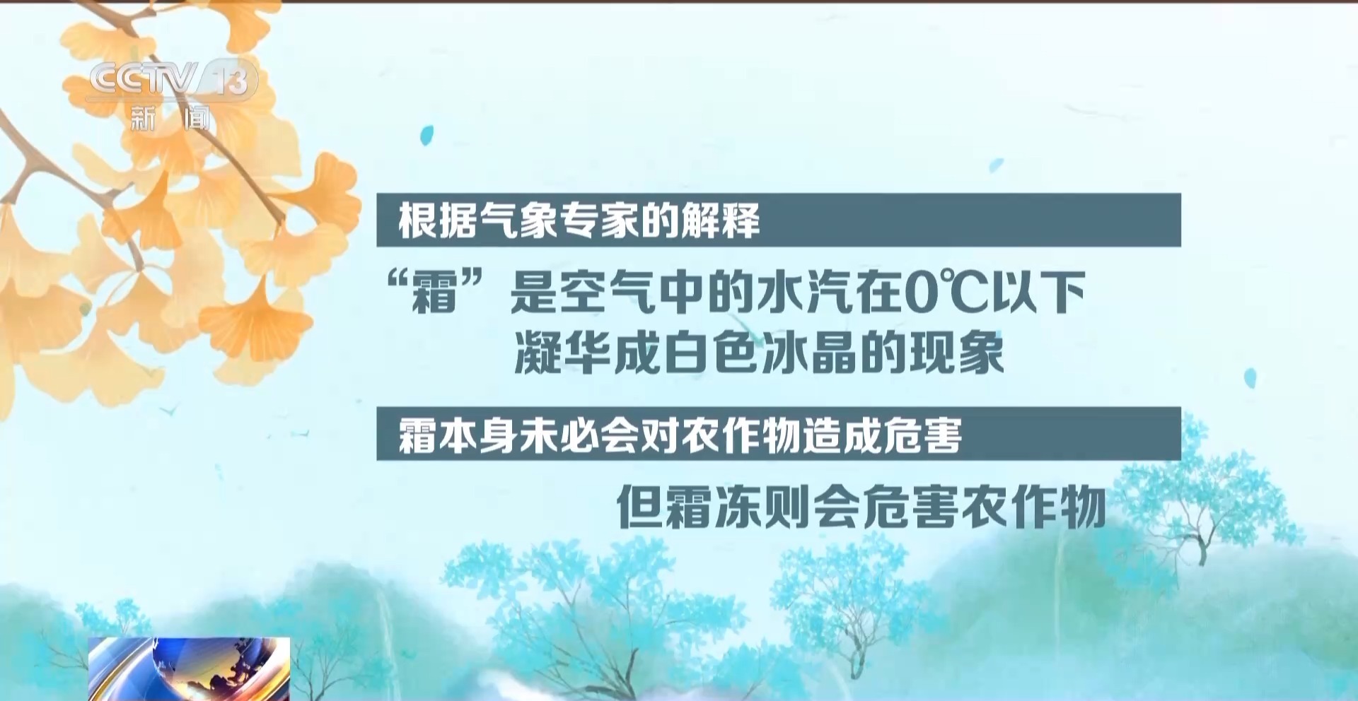 根据气象专家的解释,霜是空气中的水汽在0℃以下凝华成白色冰晶的现象。霜本身未必会对农作物造成危害,但霜冻则会危害农作物。
