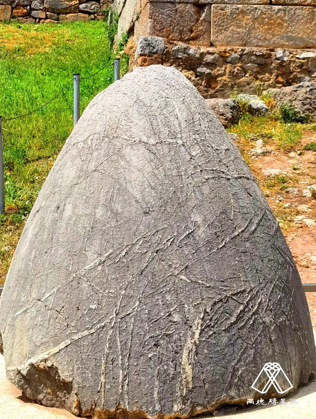 传说宙斯为了确定世界中心,便从地球的南北两极放飞了两只雄鹰,让它们以同样的速度相向而飞,最后两只鹰相会于德尔斐,宙斯由此判定这里就是地球的中心,并放置了一块圆形的石头作为标志。这块神奇的石头现在陈列在德尔斐博物馆里,而神庙前露天摆放着那块黑色的圆锥形石头,只是一块象征性的仿品。