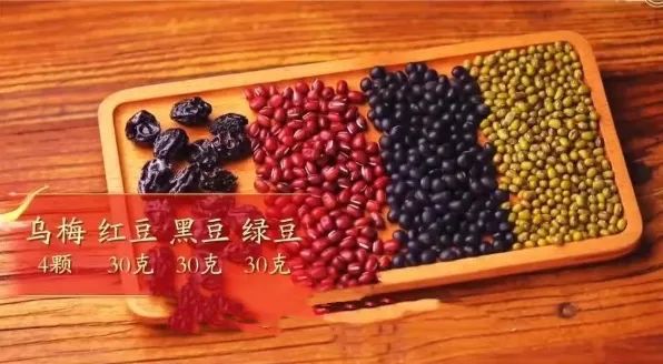 【食材】:乌梅3-4颗,绿豆30克,红豆30克,黑豆30克。