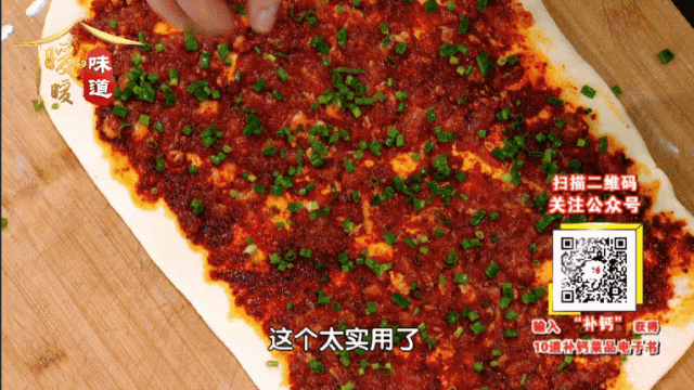4、将面团用擀面杖擀平,差不多3毫米厚。在面坯上均匀撒上1克盐,先铺一层辣椒油,再将肉馅和葱花均匀地铺在面坯上。