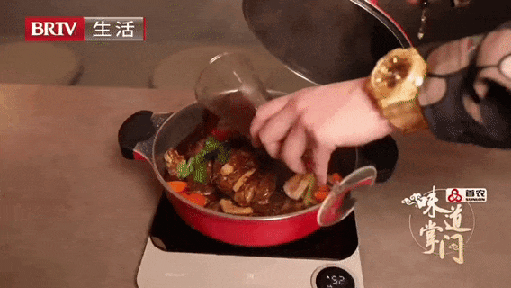 塔吉锅上桌后,还要再加上红酒,这是这道菜的最后一味料,这味料加进去只需要6分钟,就能给这道菜增色提香,还非常有仪式感。