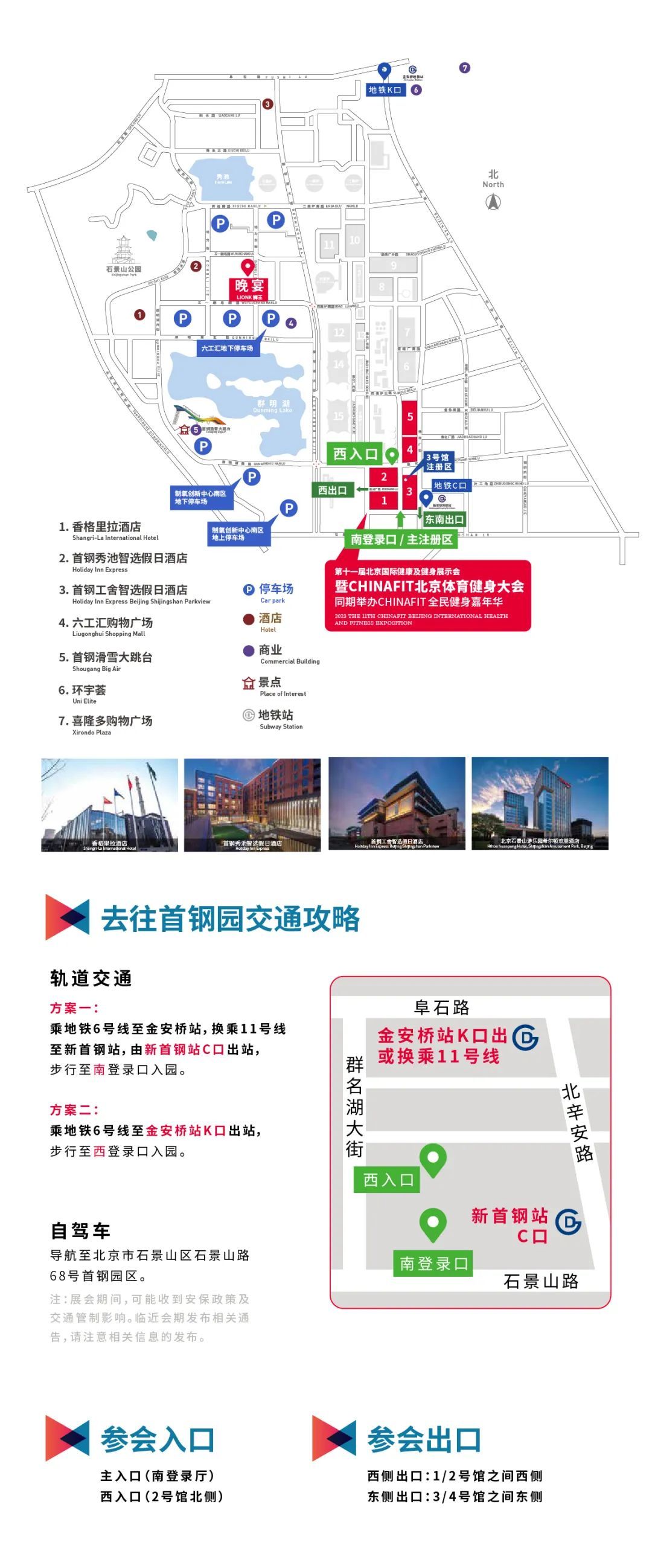 借助石景山首钢园室内外场地优势,大会设CF健身健美大会/CF体育消费品大会(1号馆)、CF瑜伽及普拉提大会/CF植物饮食大会(2号馆)、CF健身大会/CF运动康复大会(3号馆)、CF大会就餐区/北京大体协啦啦操大赛(4号馆)、CF青少儿体育大会/CF游泳及设施大会(5号馆)五大主题展馆,举办CBBA中国健美健身新人大赛、CBBA Pro中国健美健身精英职业联赛、DMS冠军经典赛、首都高等学校第七届健身舞蹈比赛、CHINAFIT团操盛典、CF瑜伽普拉提大会系列论坛、中国植物饮食大会及系列论坛等15项赛事活动和20场论坛及盛典,另外还设有30间教室,集展示、赛事、活动、交流、培训于一体,为体育行业提供良好的交流学习机会,全面推动大众健身热情及运动健康行业蓬勃发展。