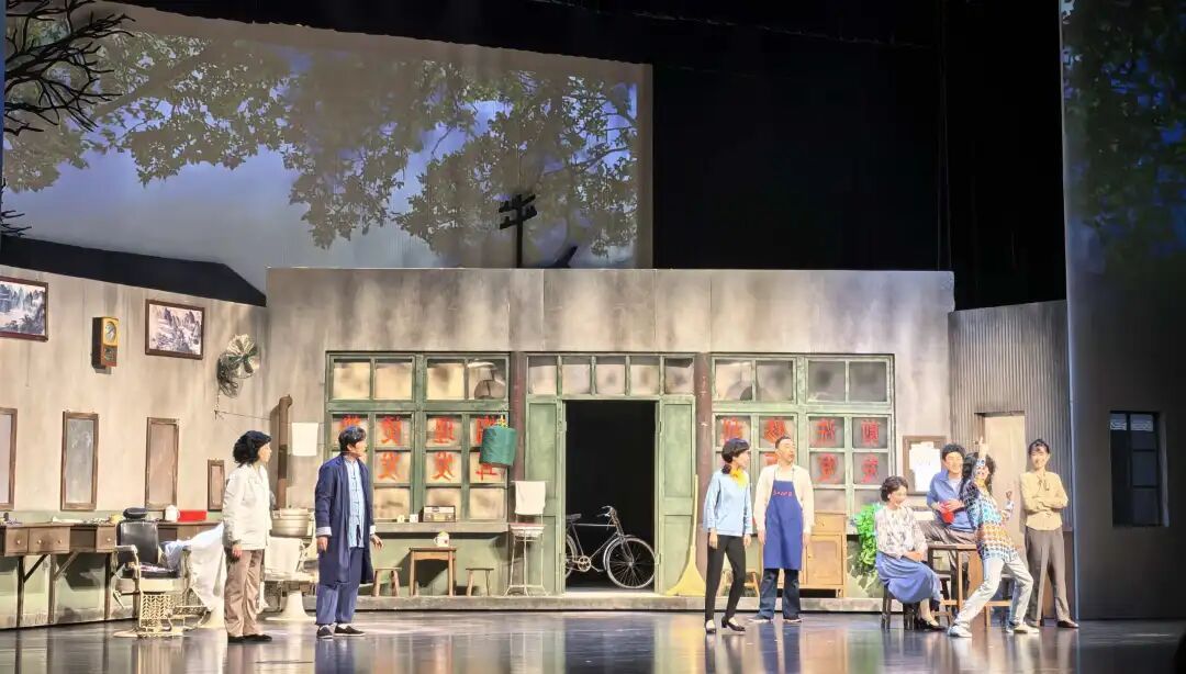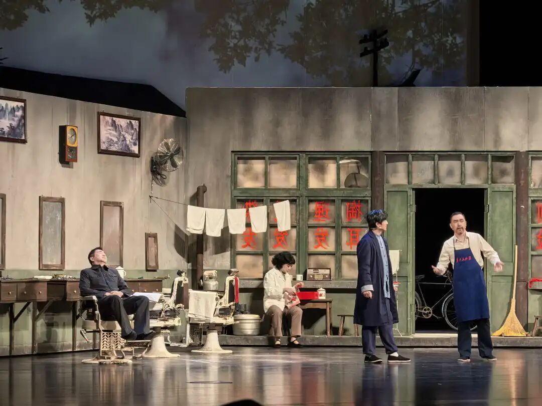 10月17日晚,随着幕布拉开,《向阳理发馆》的故事围绕杨师傅家的理发馆展开。改革开放初期,杨师傅的儿子杨从文从广东归来,一心想要打破传统,引入时髦的烫染技术,开一间新式发廊。守旧的父亲则坚持“剃头刮脸”的老手艺,不肯让步。于是,父子俩在理发馆里摆起“擂台”,一半是传统的理发椅和剃头刀,一半是时髦的招牌和彩带,生动地呈现了新与旧的冲突。一家三代传承的老理发馆,折射出大时代背景下观念的更迭与情感的绵延。