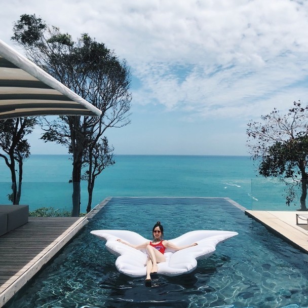 其中一张照片是邓紫棋趴在一个蚌形的白色水泡上,对镜头回眸一笑,大秀背脊线条,加上她双脚交叉摆放,令翘臀更加突出,S形身材表露无遗!在碧海蓝天的映衬下,红色比基尼超级吸睛,整个画面看上去非常美丽。不少网友都留言“太漂亮啦!”“白到反光!”“看来健身后效果很棒!”