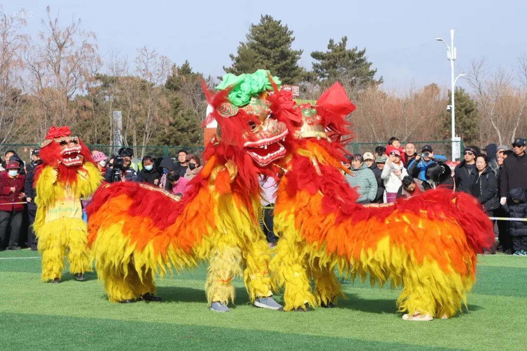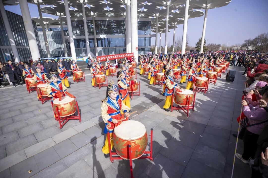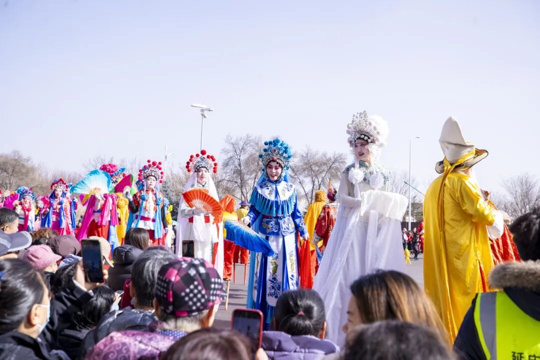 中国馆广场上,井庄镇井家庄村舞龙队的表演尤为引人注目。队员们配合默契,十余米长的金龙在他们手中盘旋升空、俯身穿梭,金鳞熠熠生辉,气势十足。文化馆冰雪竹马表演紧随其后,演员们挎着竹马迈着轻盈步伐,招式灵动,与园区雪景相映,引得观众纷纷拍照。国际馆广场上,四海镇大吉祥村高跷老会的演员踩着高跷身手矫健,转身跳跃如行云流水;文化馆大鼓队鼓手奋力擂鼓,雄浑鼓声阵阵,成为现场热门观赏点。