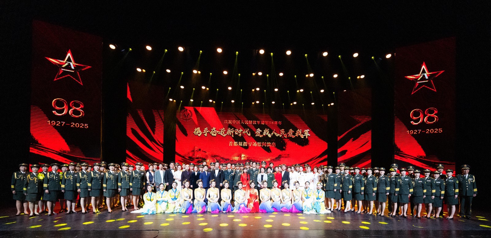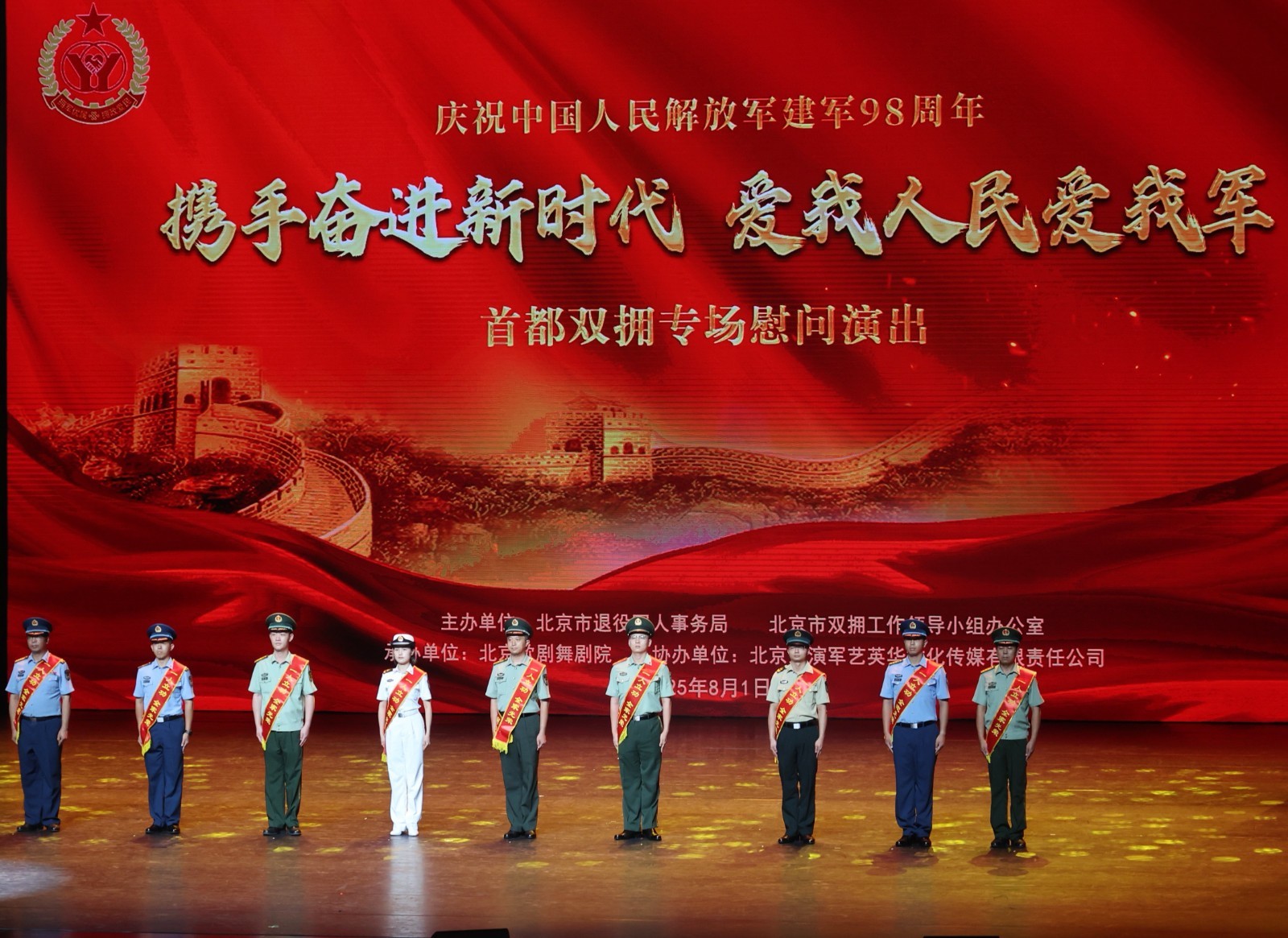 为庆祝中国人民解放军建军98周年,8月1日下午,北京市在北京艺术中心隆重举行“携手奋进新时代 爱我人民爱我军”首都双拥专场慰问演出,向驻京人民解放军指战员、武警部队官兵、军队文职人员和民兵预备役人员,致以节日的祝贺;向为人民军队建设作出贡献的全市离退休老同志、退役军人、革命伤残军人和烈军属,致以诚挚的问候;向关心支持首都发展的退役军人事务部等中央和国家机关、军委部门和部队大单位,表示衷心的感谢。