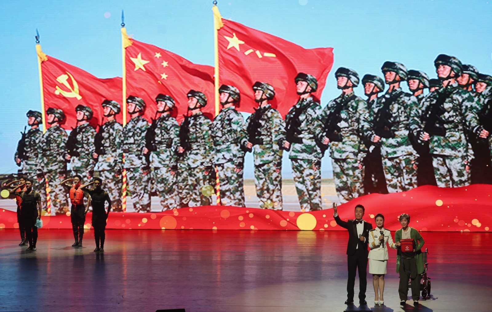 演出前,举行了慰问仪式,北京市向驻京部队赠送了慰问品,观众向立功受奖官兵代表献花。驻京部队官兵、退役军人和社会拥军组织代表、市区相关部门负责同志等800余人参加并观看演出。