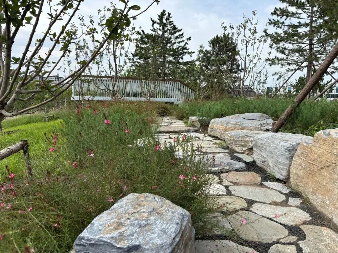 为了让“断点”变“通途”,设计施工团队打出“组合拳”,对高差区域逐一“拉坡平坎”。减河左堤路坡岸用植草格护坡,种植马蔺和原有二月兰相映成趣。京秦铁路以南段拓宽外侧绿化带至2.5米,以缓坡衔接路面,还用干码块垒起挡墙,既防雨水冲刷,又保留自然野趣。
