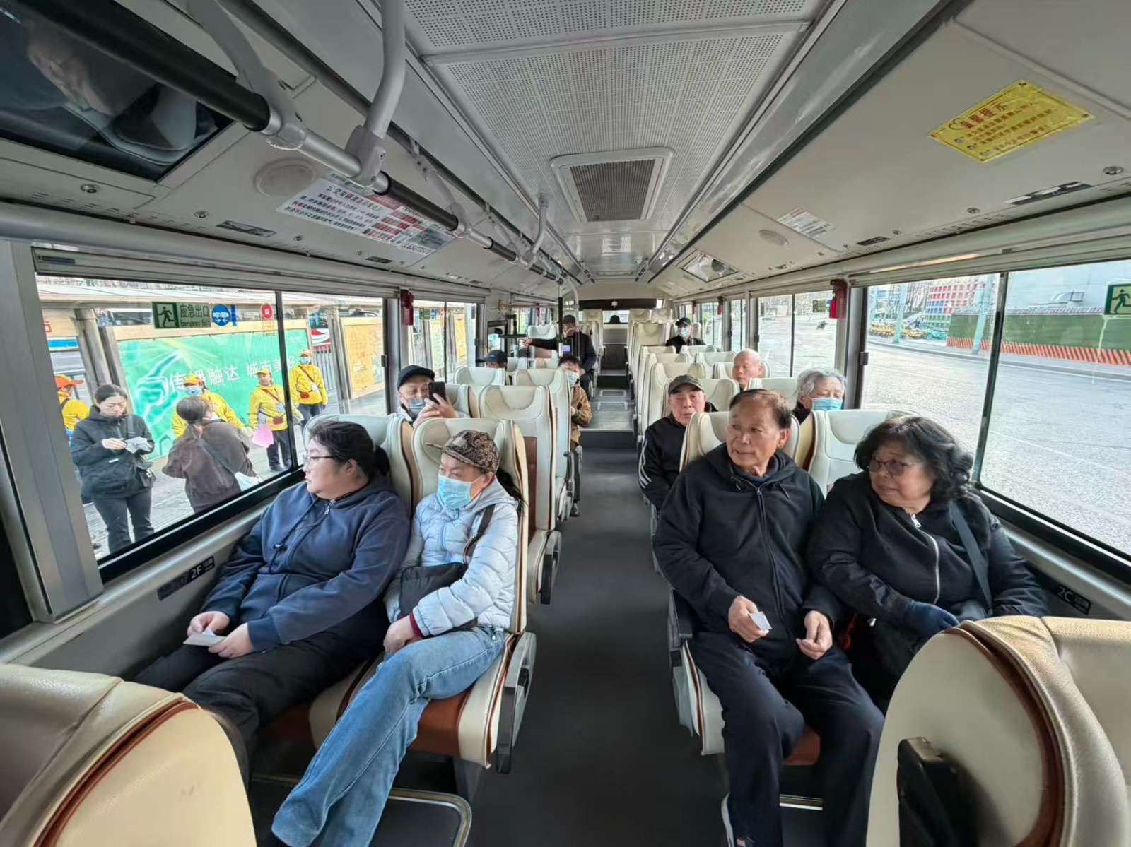 在首发现场,车辆内部整洁明亮,座椅上张贴着“文明祭扫、绿色出行”的宣传标语。志愿者们拿着纸质车票,为乘客提供现场购票服务。值得一提的是,为方便更多的乘客接驳,专线在马甸桥南(北行主路公交站)增设了上车站,车队提前安排人员在站点值守,引导乘客有序乘车,避免拥堵。