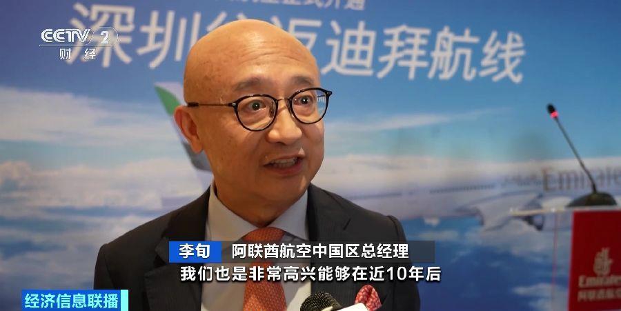 阿联酋航空中国区总经理 李旬:我们非常高兴能够在近10年后,再次新增中国的新航点。从阿联酋航空的网络来讲,不仅是去迪拜,我们也去欧洲、非洲和中东地区等。