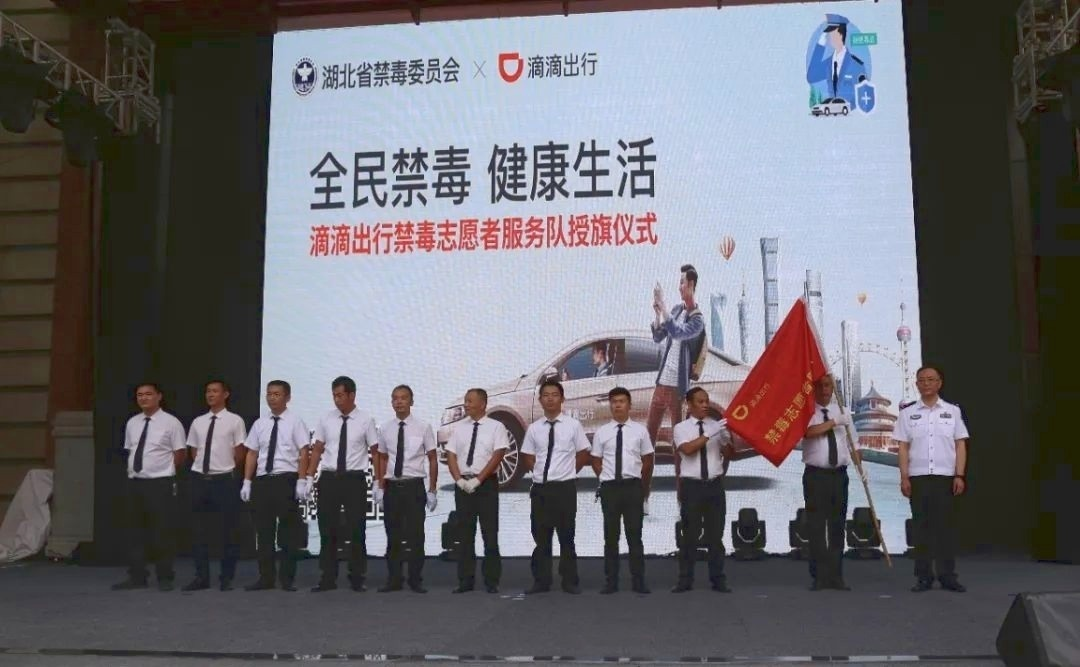 湖北省禁毒办在武汉汉街大戏台举行全省禁毒工作成果展暨滴滴出行禁毒志愿者服务队授旗仪式。与会领导为滴滴车辆张贴了禁毒宣传车标。