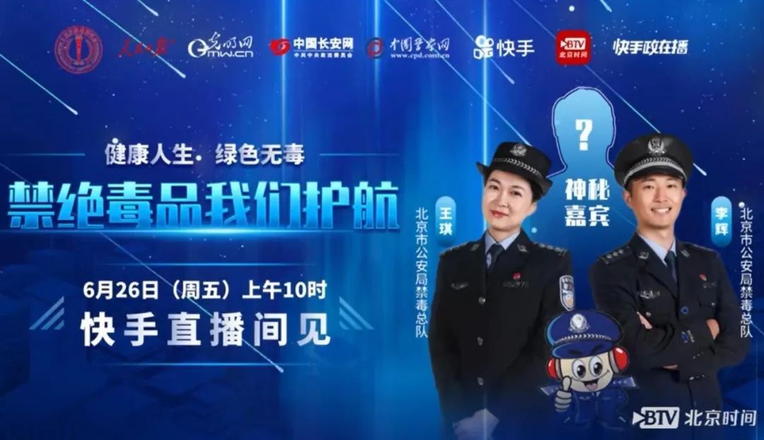 6月26日,北京市公安局联合北京市禁毒办举行了主题为“健康人生、绿色无毒——禁绝毒品、我们护航”的网络直播活动。在节目中,主持人向观众揭开了鸦片、海洛因等传统毒品的神秘面纱,同时重点讲解了“小邮票”“肥宅快乐水”等新型毒品的危害。此外,直播还通过有关专家和缉毒警察,向观众介绍了戒毒者的心路历程和真实的缉毒打击现场。