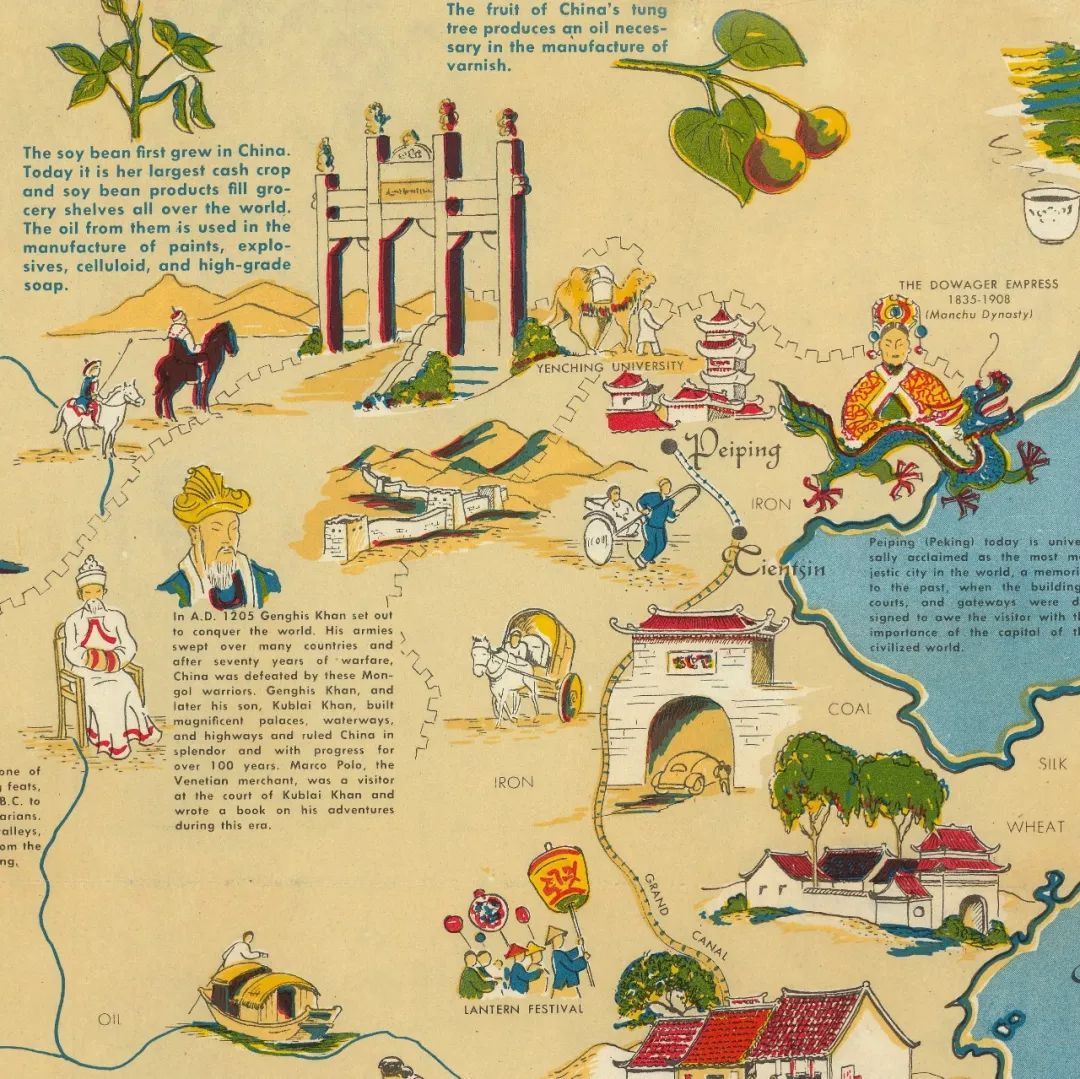 1948年,美国人Louise E.Jefferson所绘《中国友谊地图》(局部),英文地图上也有长城标识 图/书格