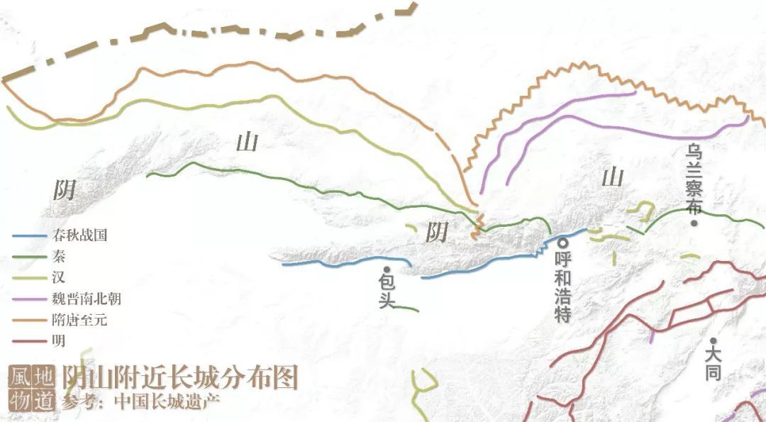 在不教胡马度过的阴山地带,汉长城在秦长城之北,北朝长城与汉长城大体持平,金长城最靠北,明长城最靠南,南北摆动的长城诉说着命运的此起彼伏。