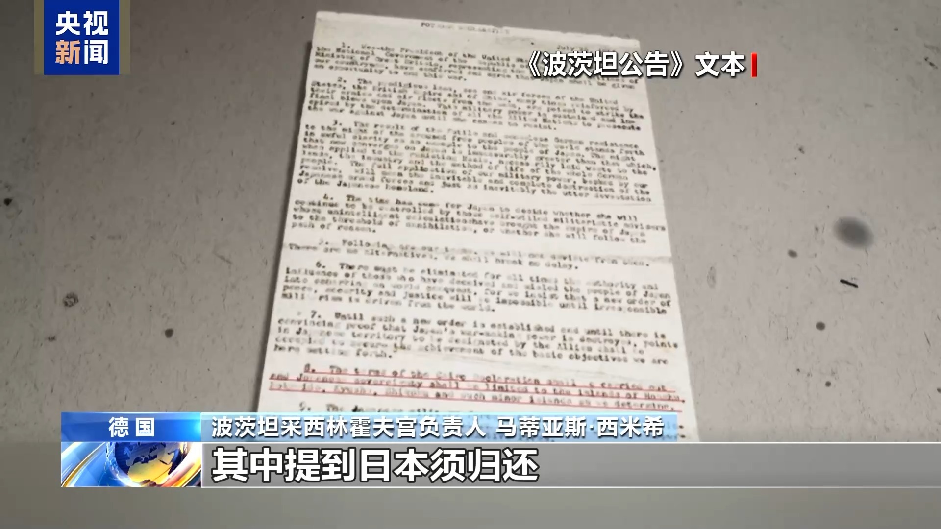 波茨坦采西林霍夫宫负责人 马蒂亚斯·西米希:《波茨坦公告》中提到了《开罗宣言》,这是公告的第八条。《开罗宣言》于1943年发布,其中提到日本须归还其在二战前或二战期间占领的所有领土。例如,台湾应归还中国,日本代表在投降书中也接受了这些宣言。所以在我看来,这是具有约束力的。