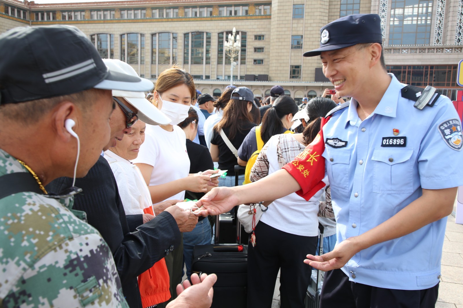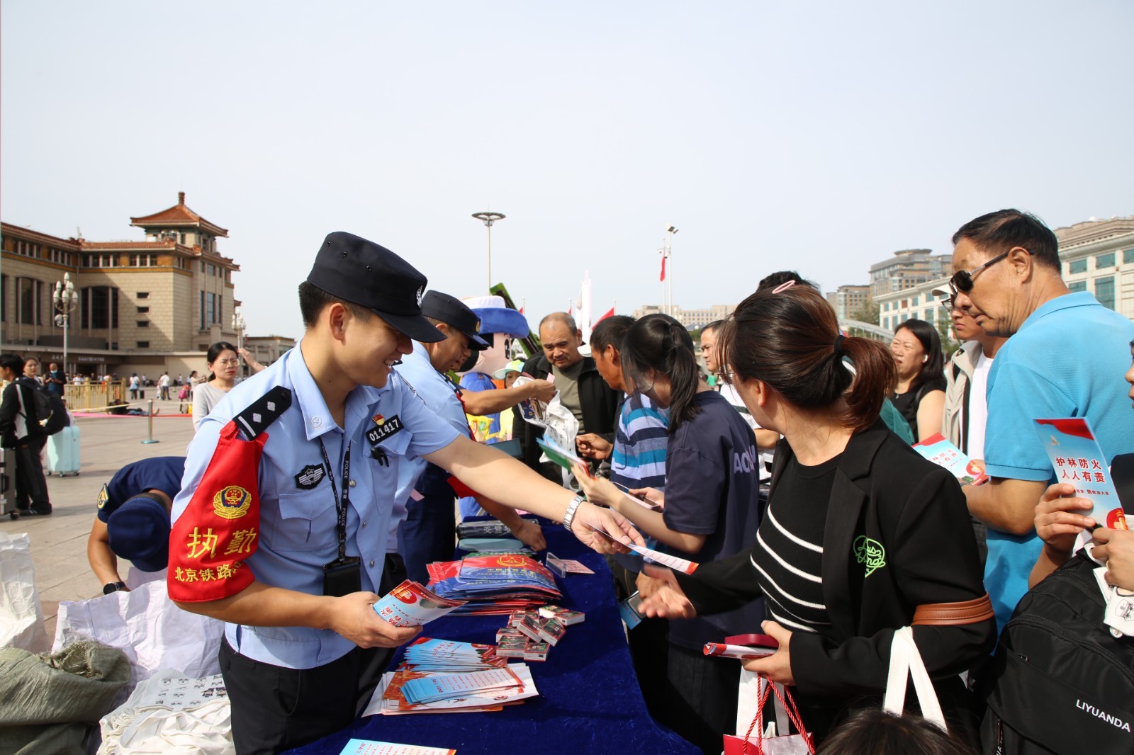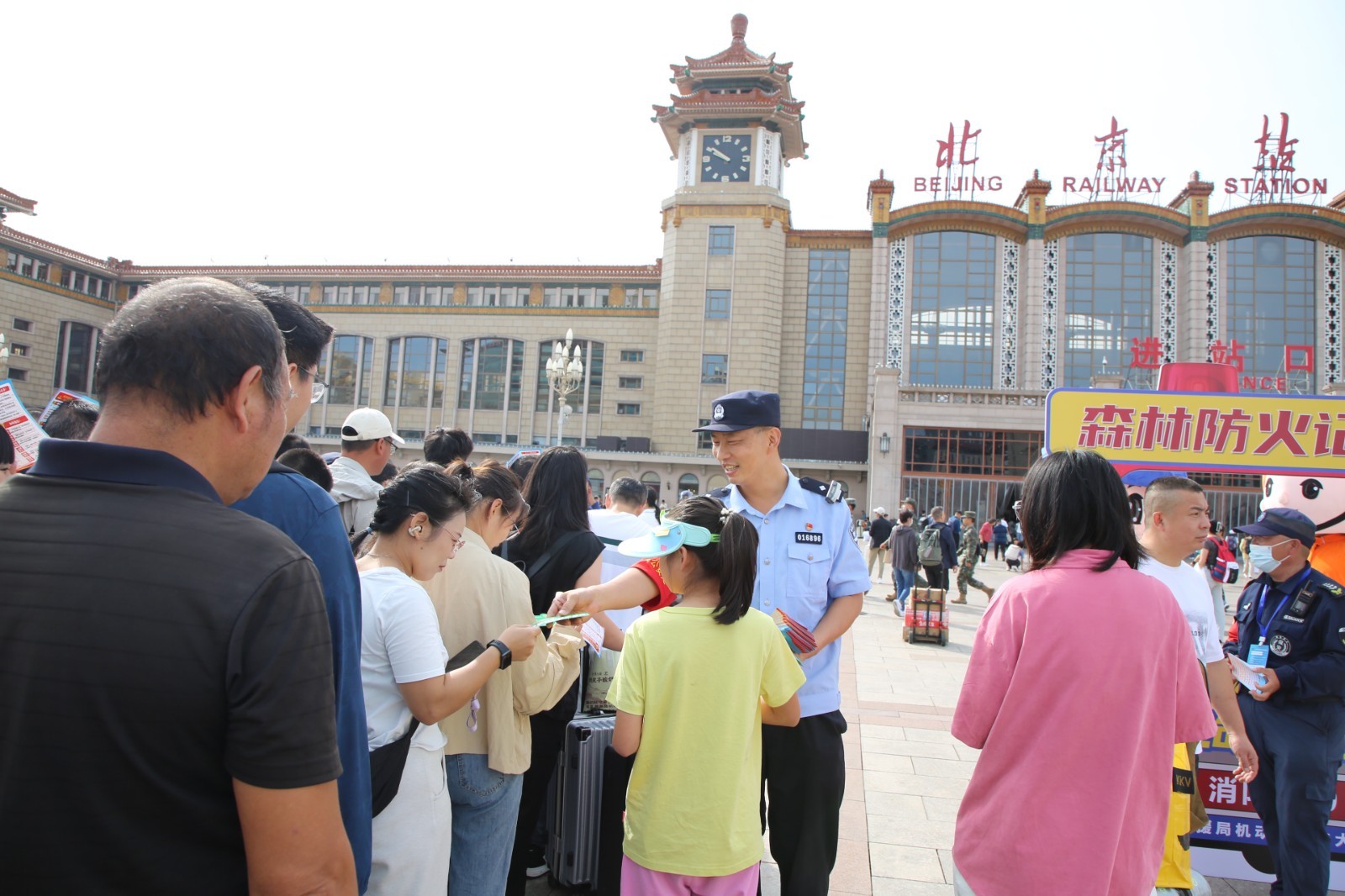 10月1日国庆节当天,北京站迎来客流高峰。为保障旅客安全,北京站派出所会同国家消防救援局机动支队房山分队、北京站重点地区管委会等单位,在北京站广场北侧开展以安全出行为主题的宣传活动。