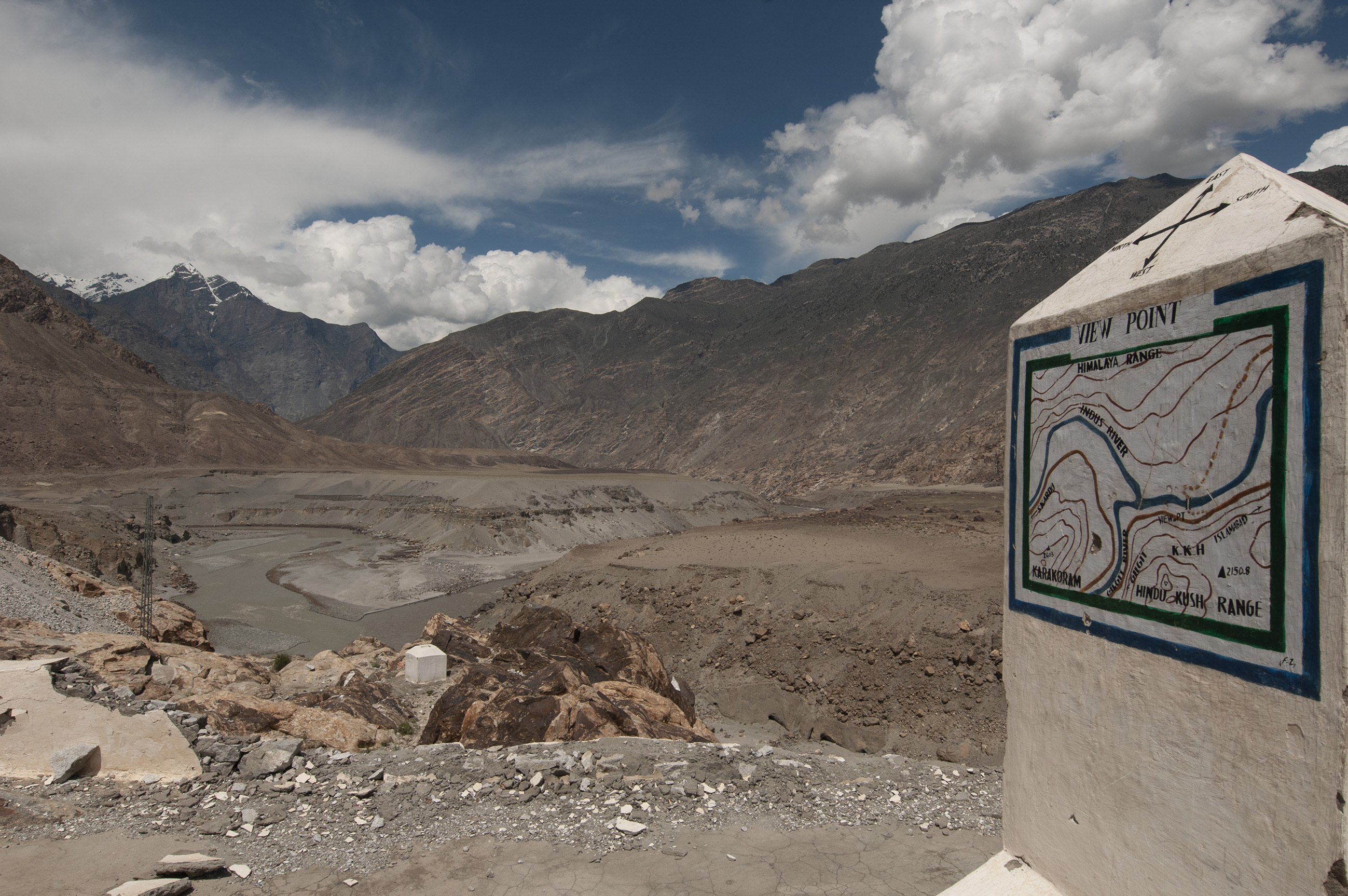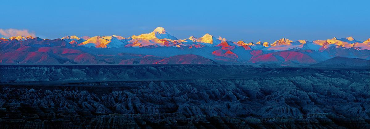 青藏高原地理分界线——(左)兴都库什山、喀喇昆仑山(中)、(右)喜马拉雅山、(前)印度河