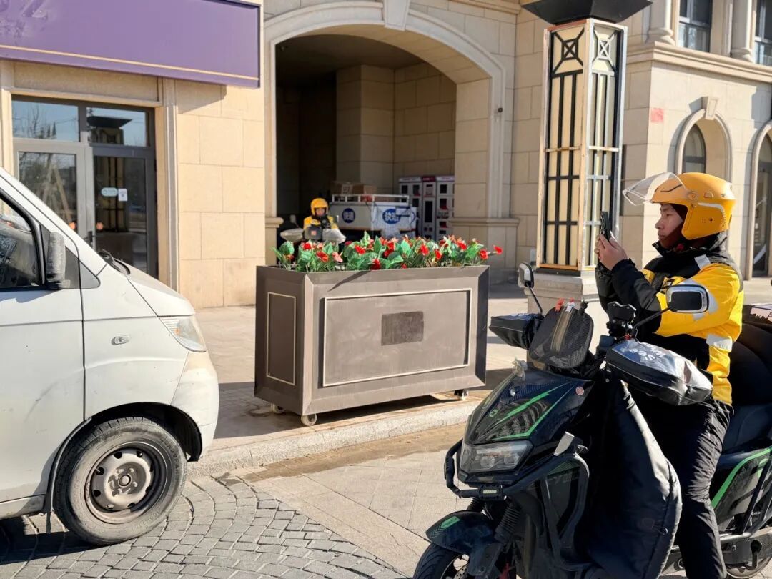 外卖骑手拍照记录车辆随意停放问题。