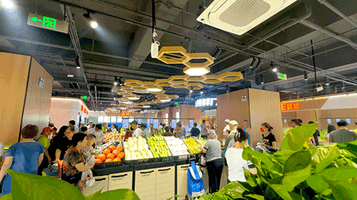 生鲜超市以“生鲜+超市+地方特产+轻餐饮”为经营特色,内部分为水果区、生鲜区、甜品区、水产区等10余个区域,方便居民挑选心仪商品。
