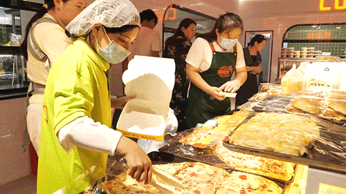 越南芒果、云南红心火龙果、赣南鲜橙、泰国榴莲等新鲜水果按时令季节“排队上架”。甜品区吸引不少家长和小朋友“光临”,披萨、蛋挞、蛋糕……从日常甜品到网红小吃,货品琳琅满目。