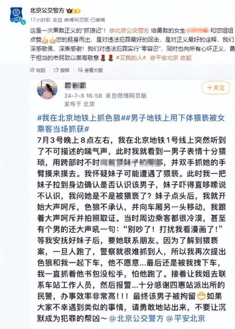 7月8日,北京公交警方发文点赞了一名地铁上挺身而出、制止猥亵行为的女乘客。