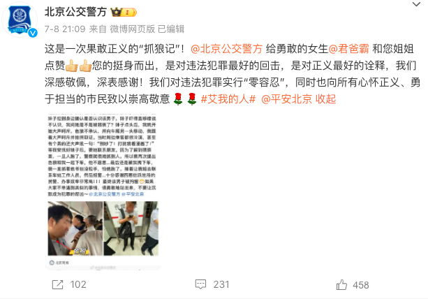 7月8日,北京公交警方发文点赞该女乘客,称:“这是一次果敢正义的‘抓狼记’!北京公交警方给勇敢的女生和您姐姐点赞,您的挺身而出,是对违法犯罪最好的回击,是对正义最好的诠释,我们深感敬佩,深表感谢!我们对违法犯罪实行‘零容忍’,同时也向所有心怀正义、勇于担当的市民致以崇高敬意。”