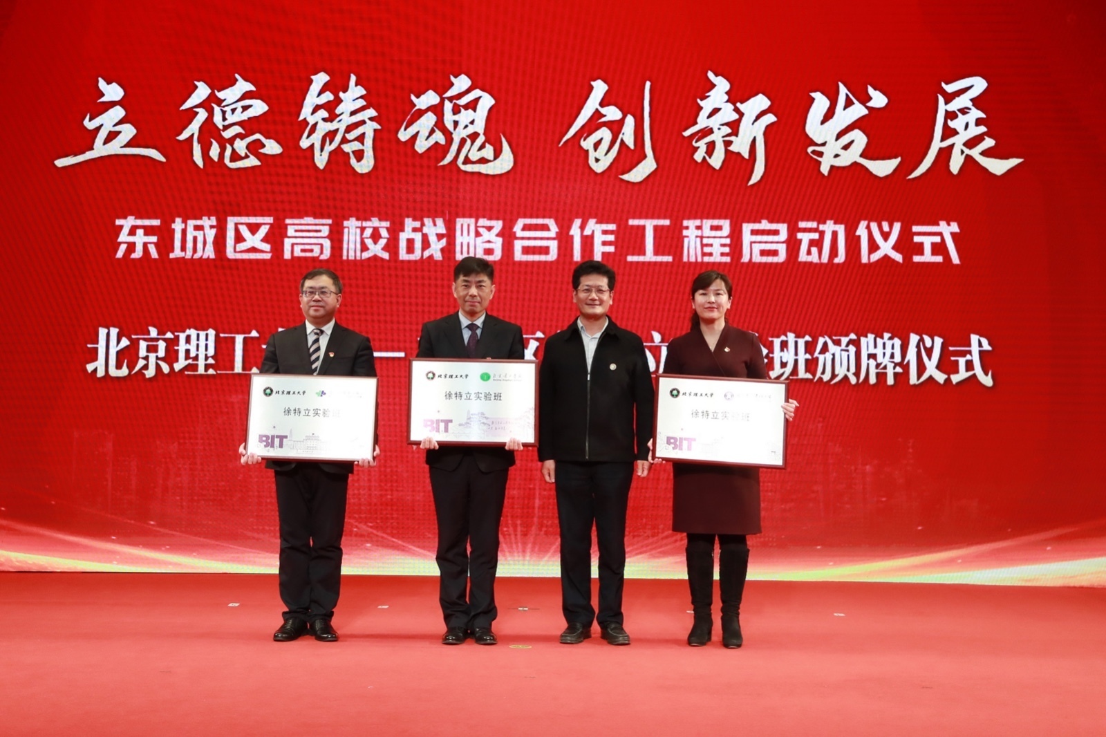 3月2日,“立德铸魂创新发展”东城区高校战略合作工程启动仪式暨“院士进校园”开学第一课在北京景山学校隆重举行。当天,北京理工大学与东城区联合共建的14个“创新人才培养基地”颁牌仪式同步举办。今后,北京景山学校、北京市东直门中学、北京市第二中学、北京市第五中学、北京市第十一中学、北京第五十中学、北京第五十五中学、北京第一零九中学、北京市第一六六中学、北京市第一七一中学、北京汇文中学、北京市广渠门中学等12个示范校,以及东城区青少年科技馆、东城区崇文青少年科技馆等2个教育单位将以共建方式,促进基础教育与高校间优势资源的共享融通,助力东城区普通高中多样化特色发展,及青少年科技创新。
