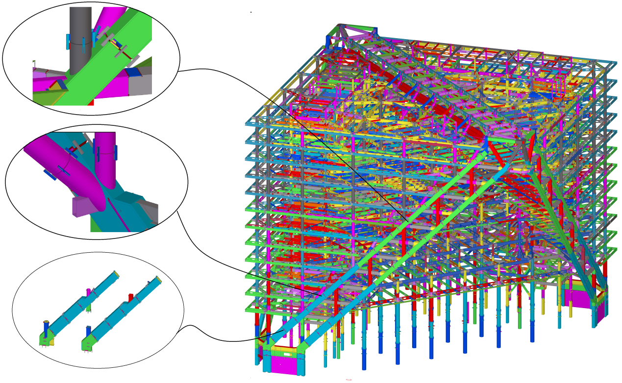 该项目结构立面呈现为不规则大悬挑,巨型斜撑为“日”字形、“目”字形和箱型截面,最大板厚为80毫米,单个构件重达23.5吨。要将悬挑支撑与腹杆组成桁架,与楼层梁、斜柱紧密连接,并保证焊接严密、刚性达标,必须从深化设计阶段进行合理规划和提前策划。