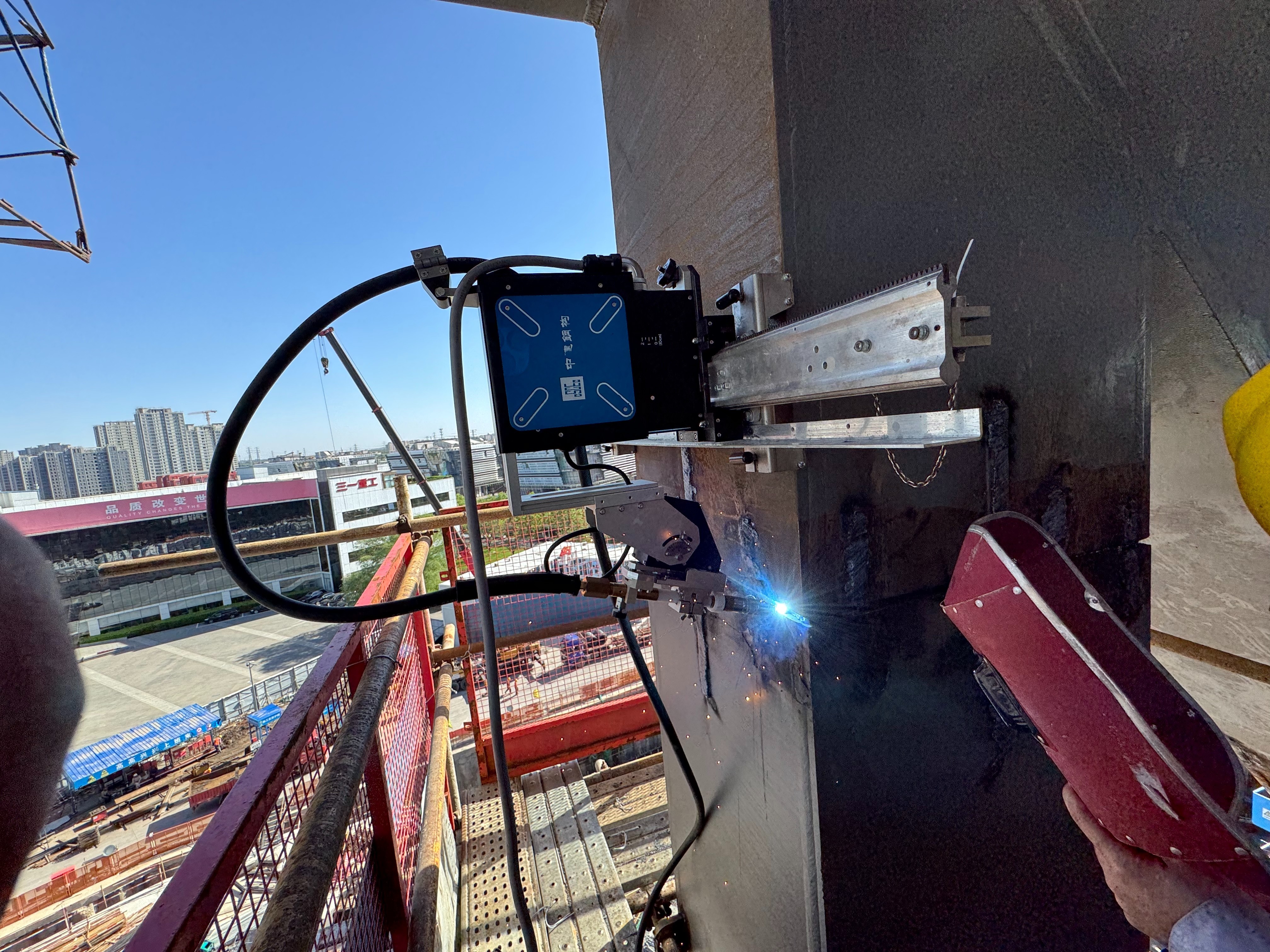 项目现场,还涉及大量钢构件焊接作业。项目团队引入了中建科工自主研发的工地mini弧形焊接机器人,通过先进的接触传感技术,精准识别焊缝宽度、深度和角度,智能生成多层多道焊接路径,实现焊接作业高效、精准、一次性优质完成。相较传统的人工焊接,提升效率高达40%。