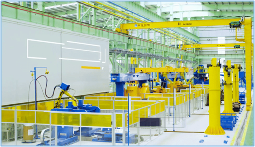在钢构件生产方面,项目团队充分发挥中建科工自主建设的钢结构制造基地优势,实现钢构件从前端设计到后端生产的全过程管控。在构件制造过程中,采用了中建科工自主研发的全自动切割机器人、牛腿焊接机器人、H型焊接机器人、箱型总成机器人等,有效实现了机器代人,使构件加工精度提升5%,制作效率提升12%。对比传统加工制作流程,降低劳动力投入约80%。